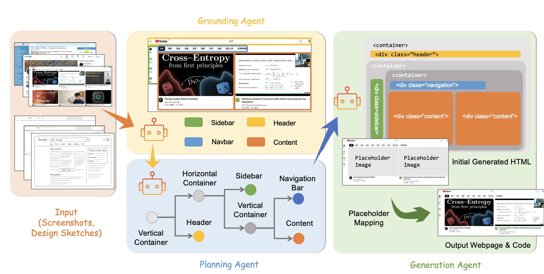 A showcase of how ScreenCoder transforms UI screenshots into structured, editable HTML/CSS code using a modular multi-agent framework.